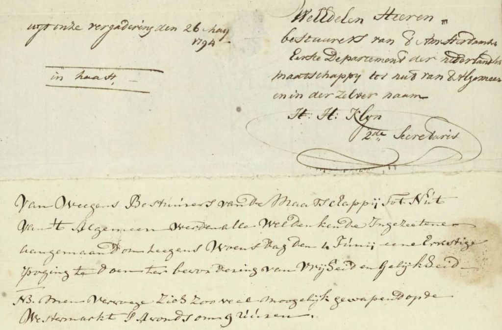 ‘Nepnieuws’ in 1794. De bestuurders van de Maatschappij tot Nut van ’t Algemeen waren boos over valse berichten dat zij Amsterdammers opriepen tot revolutie.